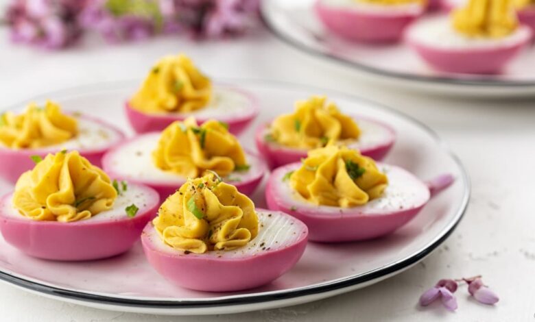 Surpriza apare în peisaj atunci când în loc de ouăle fierte clasice folosești ouă murate cu puțină sfeclă sau sos de soia (<– clic pe link pentru rețetă) – pe lângă culoarea deosebită a albușului, vei avea parte și de un gust special, delicios și de neuitat, jur! 🙂