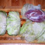 Între timp, se taie foi de varză ca pentru sarmale care se opăresc 5 minute bune în apă fiartă cu sare, după care se scot și se pun la răcit intr-o sită frumoasă, de bucătărie.