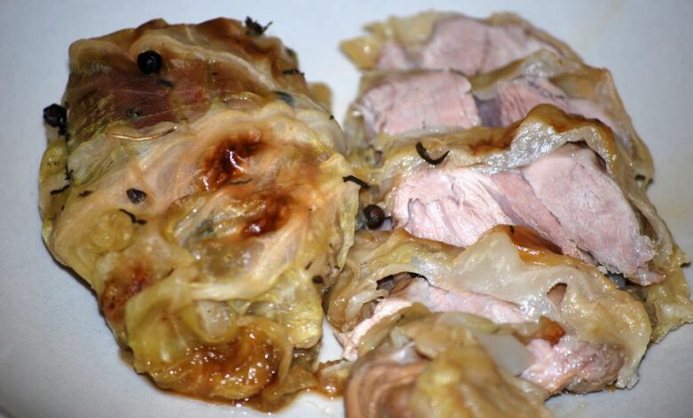 La momentul potrivit, carnea se invelește binișor în foile de varză opărite și răcite si se așează cu multă grijă și evlavie culinară într-o oala încăpătoare în care vărsăm și vinul rămas de la fezandare.
