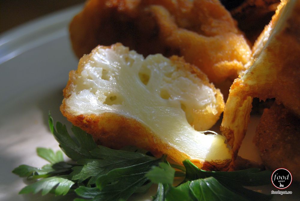 haurii. - Buchețelele de conopidă scurse de apă și racite se sărează puțin și se trec prin aluat, apoi pesmet și se prăjesc ca mai sus.
