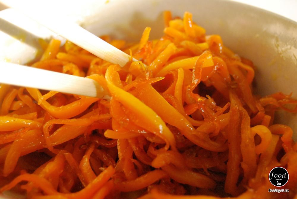 - Morcovii se spală bine, se curăță cu sârguință și se feliază longitudinal Julienne cu răbdare, multa răbdare și rafinament. Mulți preferă varianta datului prin răzătoarea mare, dar vă garantez ca fâșiuțele taiate cu grijă și migală asiatică nu au egal.